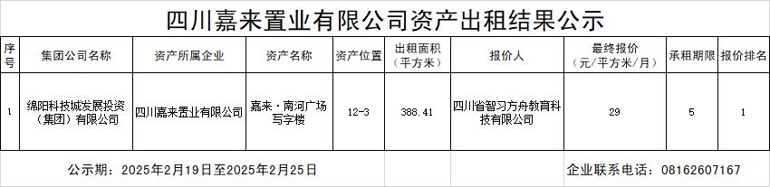 四川嘉來置業(yè)有限公司資產(chǎn)出租結(jié)果公示