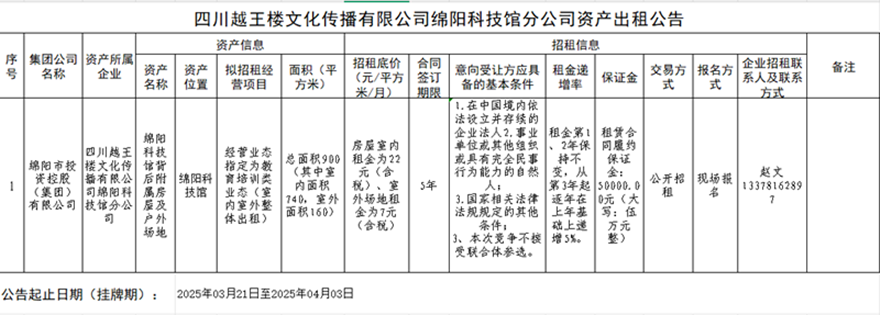四川越王樓文化傳播有限公司綿陽(yáng)科技館分公司資產(chǎn)出租公告