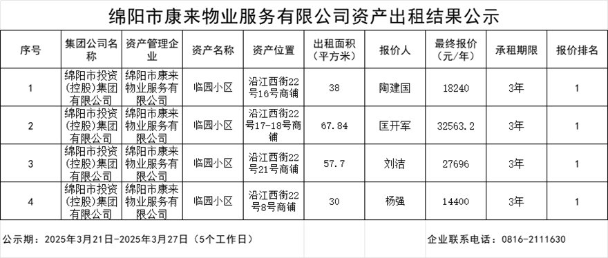 綿陽(yáng)市康來(lái)物業(yè)服務(wù)有限公司資產(chǎn)出租結(jié)果公示
