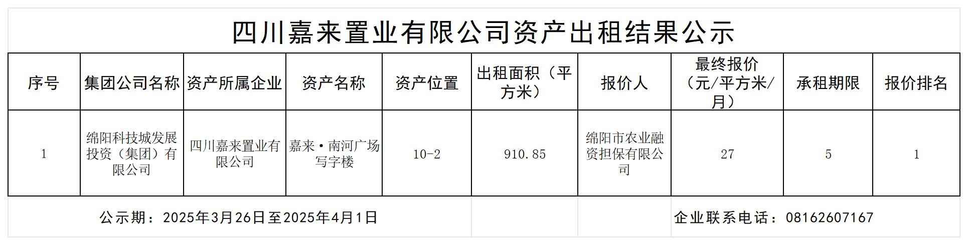 四川嘉來(lái)置業(yè)有限公司資產(chǎn)出租結(jié)果公示