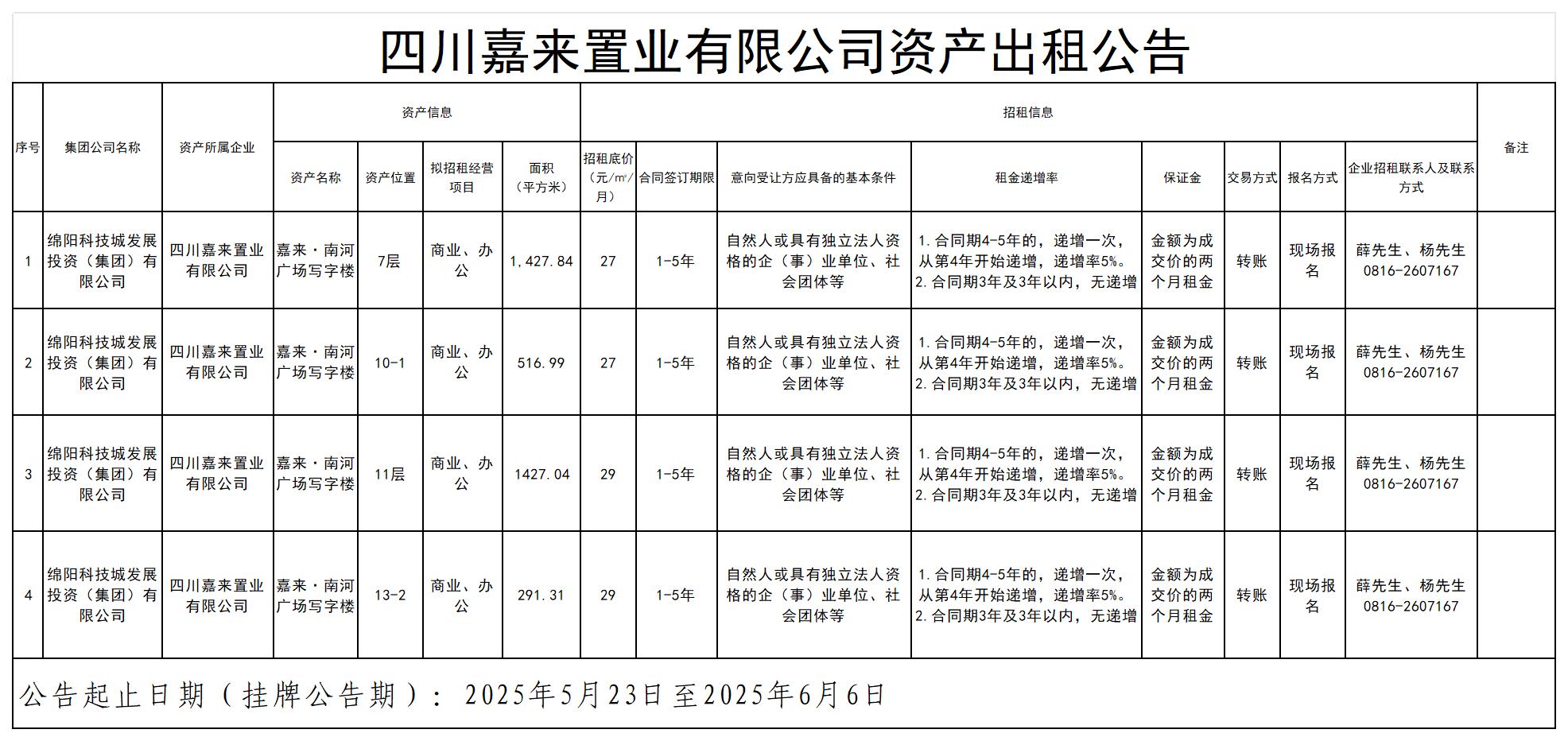 四川嘉來(lái)置業(yè)有限公司資產(chǎn)出租公告