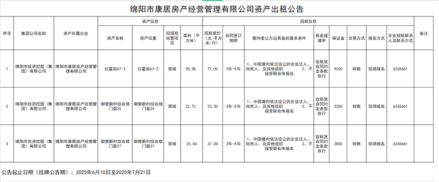 綿陽(yáng)市康居房產(chǎn)經(jīng)營(yíng)管理有限公司資產(chǎn)出租公示