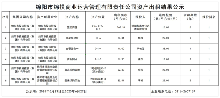 綿陽(yáng)市綿投商業(yè)運(yùn)營(yíng)管理有限責(zé)任公司資產(chǎn)出租結(jié)果公示