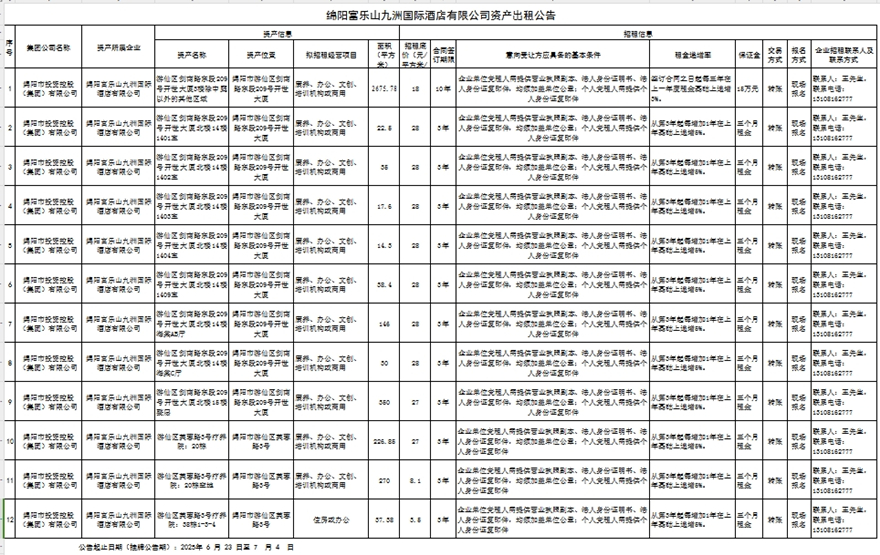 綿陽富樂山九洲國際酒店有限公司資產(chǎn)出租公告