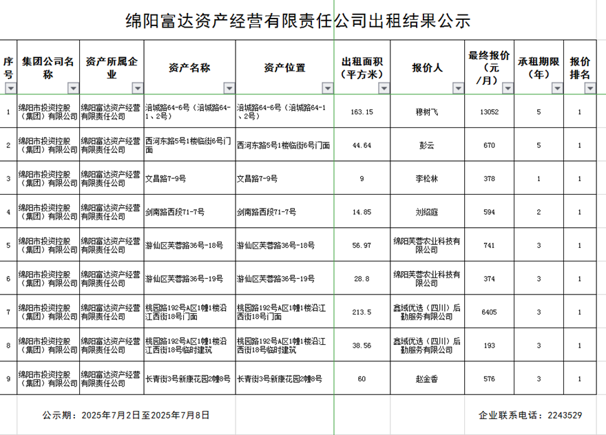 綿陽(yáng)富達(dá)資產(chǎn)經(jīng)營(yíng)有限責(zé)任公司出租結(jié)果公示
