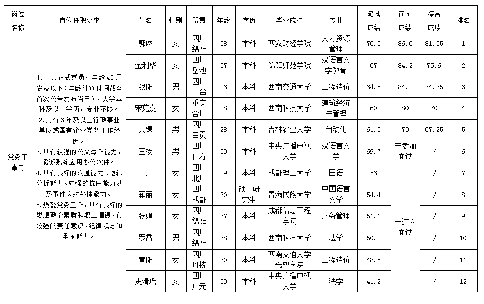 根據(jù)綿陽市投資控股(集團)有限公司發(fā)布的招聘公告及招聘相關(guān)規(guī)定,經(jīng)筆試、面試等程序,現(xiàn)將筆試(面試)成績予以公示。