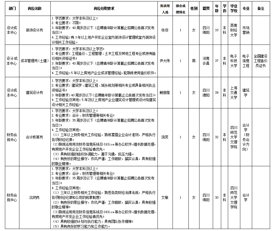 根據綿陽市綿投置地有限公司發(fā)布的招聘公告及招聘相關規(guī)定,經筆試、面試、考察、體檢等程序,擬錄用張俊等5名同志到綿陽市綿投置地有限公司工作,現(xiàn)予以公示,具體情況如下:
