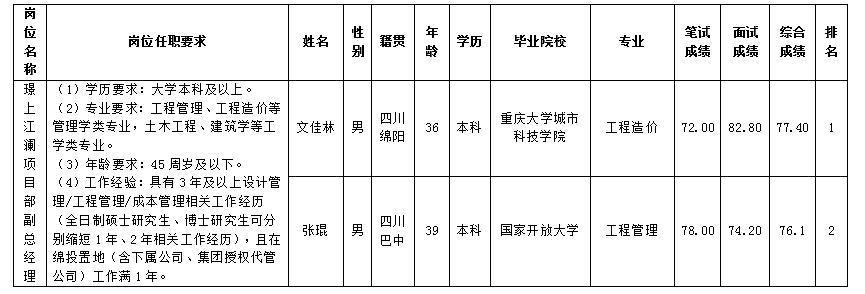 根據(jù)綿陽市綿投置地有限公司發(fā)布的招聘公告及招聘相關(guān)規(guī)定,經(jīng)筆試、面試等程序,現(xiàn)將筆試、面試成績(jī)予以公示。