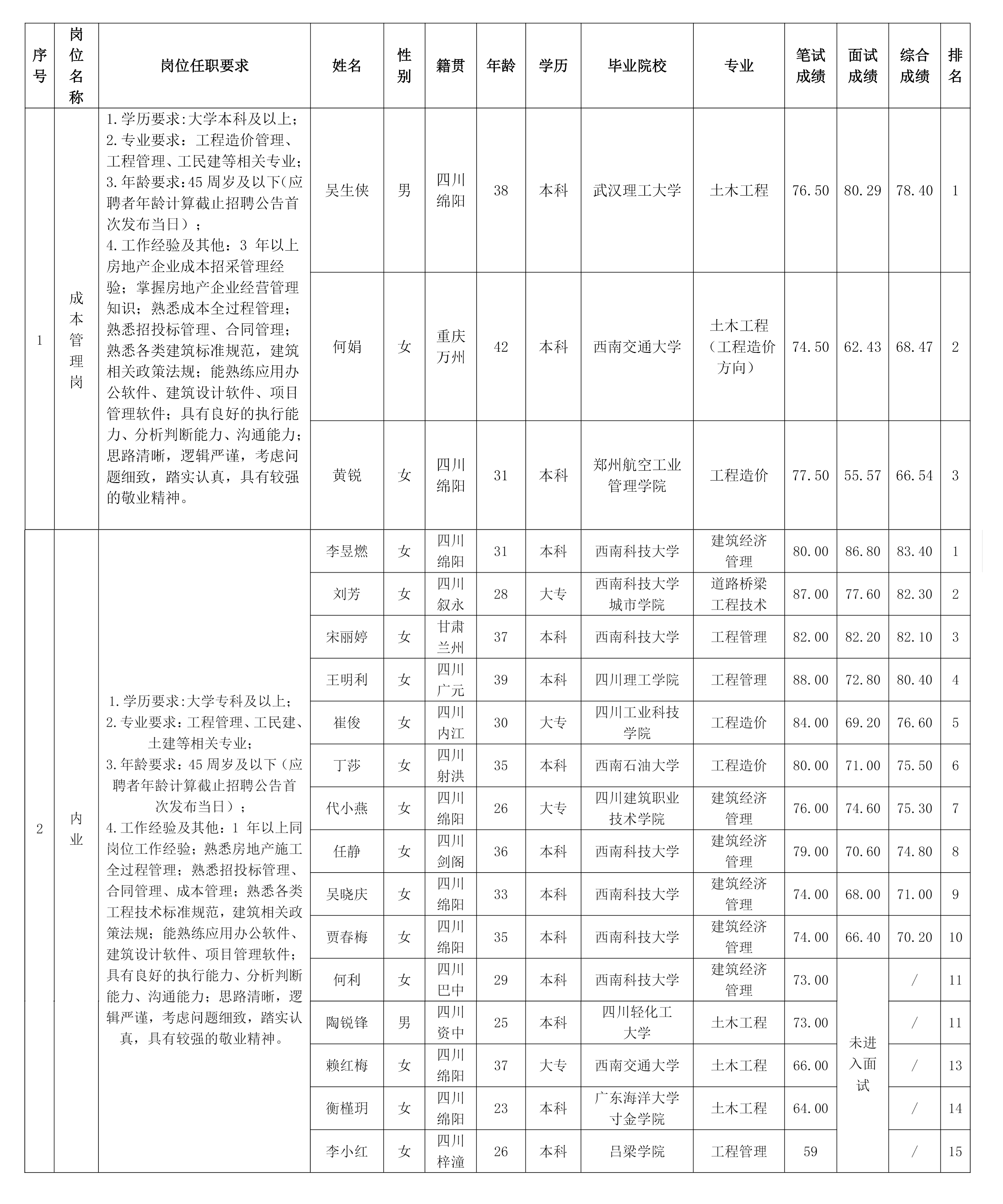 根據綿陽市綿投置地有限公司發(fā)布的招聘公告及招聘相關規(guī)定,經筆試、面試等程序,現將筆試、面試成績予以公示。