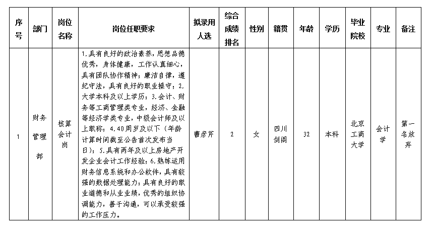 根據(jù)綿陽市嘉遠(yuǎn)瑞華房地產(chǎn)開發(fā)有限公司發(fā)布的招聘公告及招聘相關(guān)規(guī)定,經(jīng)筆試、面試、考察、體檢等程序,擬錄用曹彥芹同志到核算會計(jì)崗工作,現(xiàn)予以公示,具體情況如下: