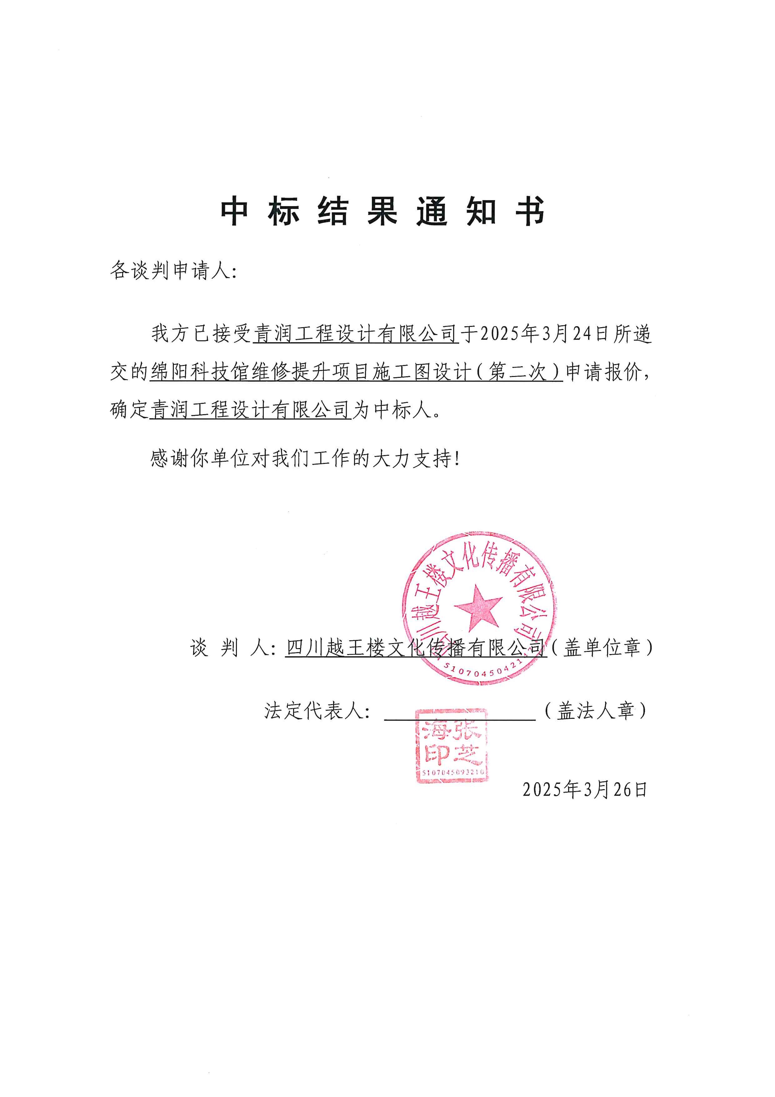 綿陽科技館維修提升項目施工圖設(shè)計(第二次)競爭性談判結(jié)果公告